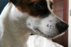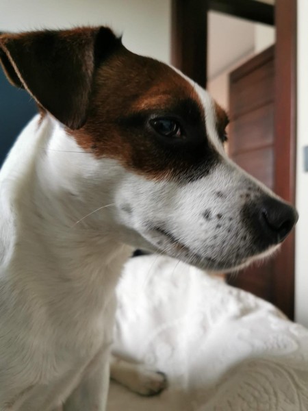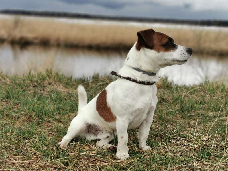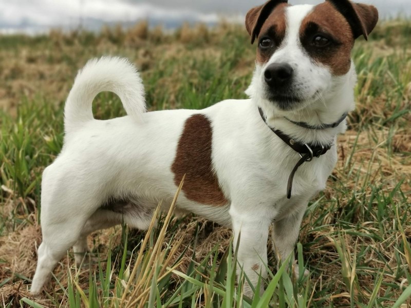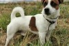 Džeka rasela terjers, balts ar brūnām seju un ausīm, brūns plankums uz sāna. Labsirdīgs, draudzīgs.
