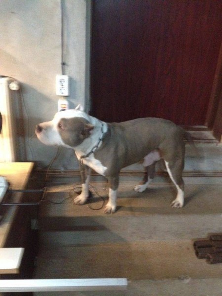 Stafordšīras terjers, pelēks ar baltu, labā puse balta, bez saites, labs pret cilvēkiem, ļoti draudzīgs ar suņiem ne īsti labi sadzīvo, atsaucas uz vārdu Grams