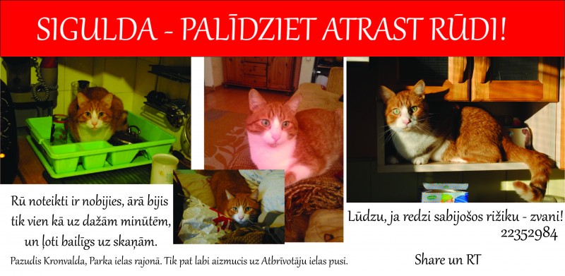 naktī uz 13.jūliju Siguldā, Ata Kronvalda ielā pa logu izkritis un pazudis runcis. Paliela auguma, rižs. Uz baltās pakaklītes ir ruda līnija. Ļoti runīgs. Tomēr ārā ir ļoti bailīgs, dzīvokļa kaķis tomēr.