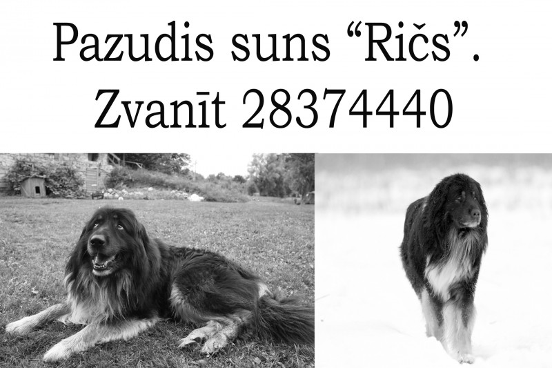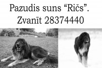 8.07. TEC-2/Granīta ielas raj. pazudis liels, melns suns. Varētu klīst arī Rumbulā, Ķengaragā, Pļaviekos. Garspalvains, melns, gaišām kājām/pakakli - Kaukāza/VAS krustojums, līdzīgs bernietim. Bija žetons. Draudzīgs, biedrojas ar svešiem. ATLĪDZĪBA!
