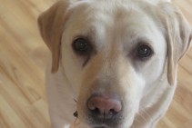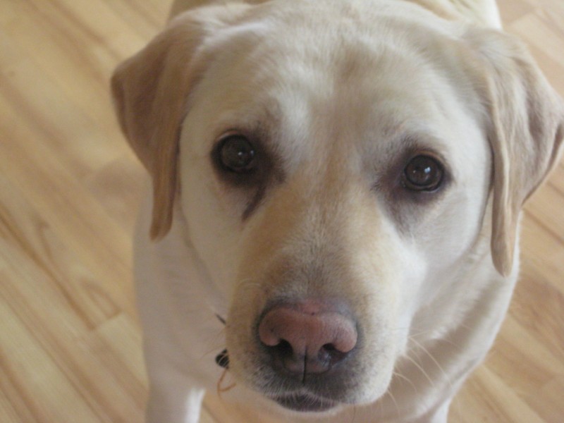 Dzeltenais labradors, augumā nedaudz mazāks par citiem labradoriem. Ap kaklu sarkana siksna