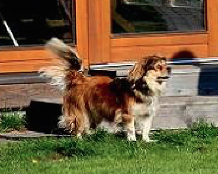 Ap kaklu sikniņa ar kuliniņu, uz kura rakstīts gan suņa vārds, gan īpašnieka telefona numurs.