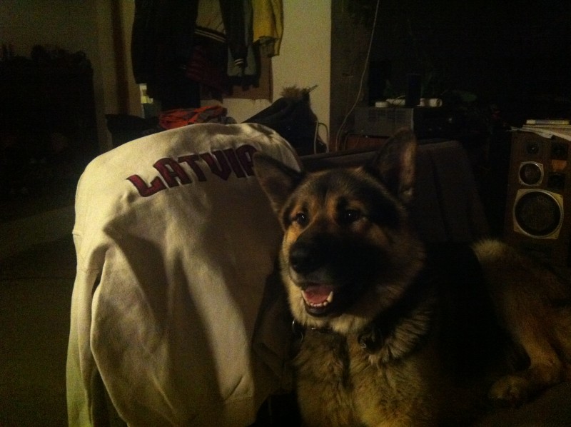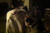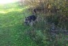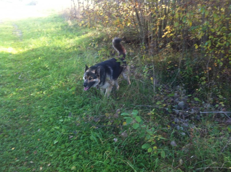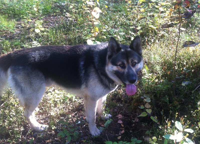 Liels, jauns, vācu aitu suņa un malamuta šķ. krust., ap kaklu bieza, raupja auduma kakla siksna zaļganbrūnā krāsā.