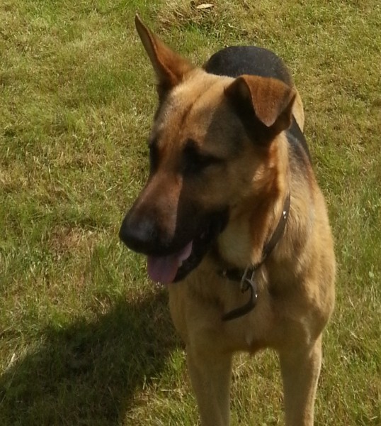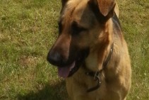 Vācu aitas suns. Atsaucas uz vārdu TAISONS. Ir ļoti draudzīgs. Nedaudz noļukusi viena auss.