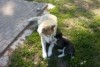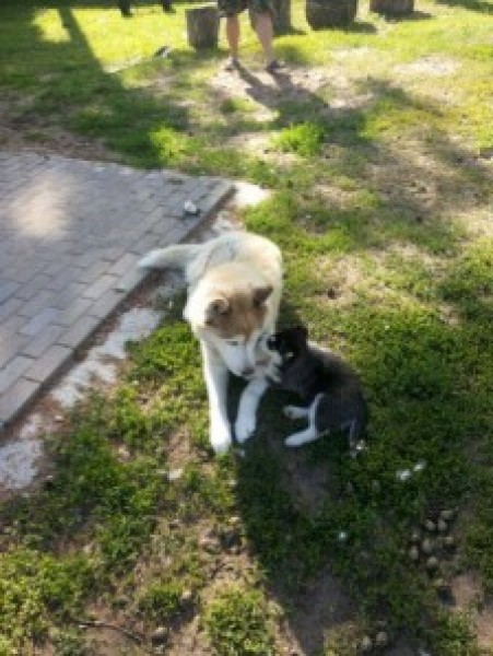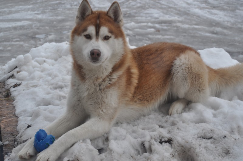 Balts ar brūnu ar brūnām acīm Sibīrijas haskijs. draudzīgs