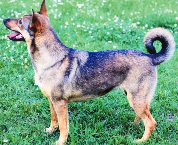 Pavilna, galva un kājas brūnganie toņi, ar melnu akotu; atsaucas uz vārdu - Reda; bez kaklasiksnas.