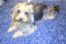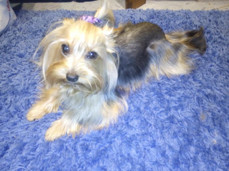 Mini jorkšīras terjers. Nesen apcirpts, uz muguras īsa spalva. Augšžoklim katrā pusē pa diviem ilkņiem.