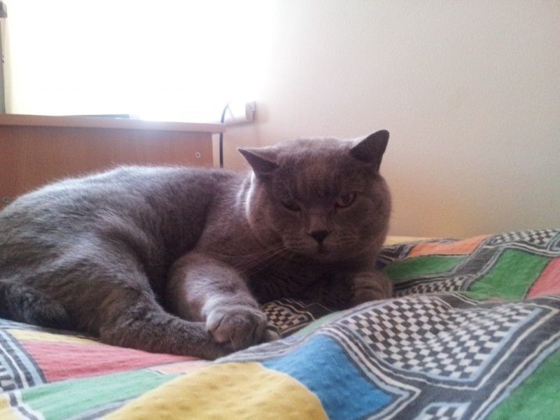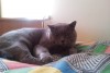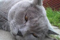 Britu īsspalvainais kaķis (tēviņš, kastrēts), 9.gadi, medus krāsas acīm, pelēkā krāsā. Iespējams, cietis, cīnoties ar citu kaķi 28.02.2015.Siguļos.