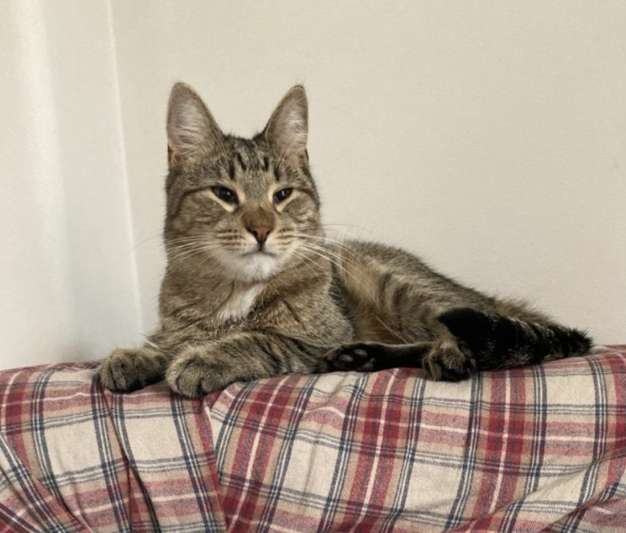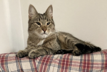 pelēkbrūni strīpains kaķis, atsaucas uz vārdu Rafi, mazs balts pleķītis zem zoda, reģistrēts mikročips, mājas kaķis, draudzīgs, bail no ārpasaules