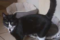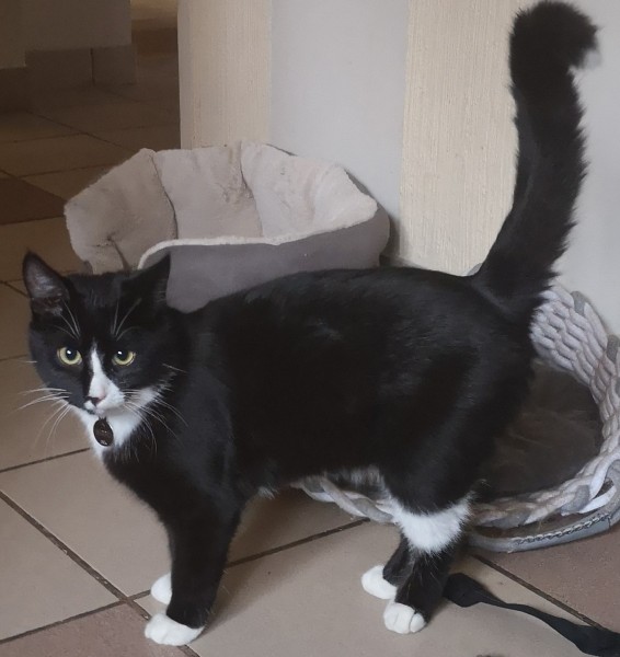 Melns ar baltu kaķītis, 7 mēnešus vecs. Pazušanas brīdī ap kaklu bija siksniņa un piekariņš ar tālruņa numuru