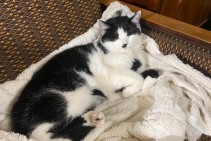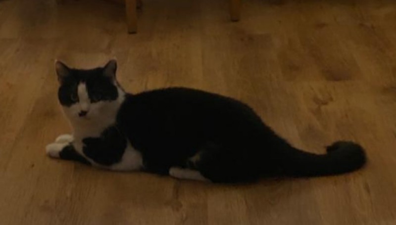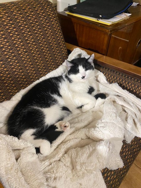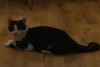 Melns ar balto kaķis, sejā ir melns plankums virs mutes.