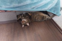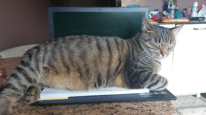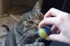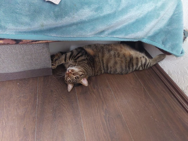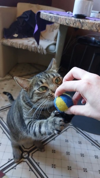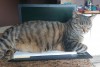 Pelēks, svītrains kaķis. Vārds ir Cēzars