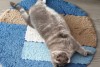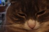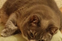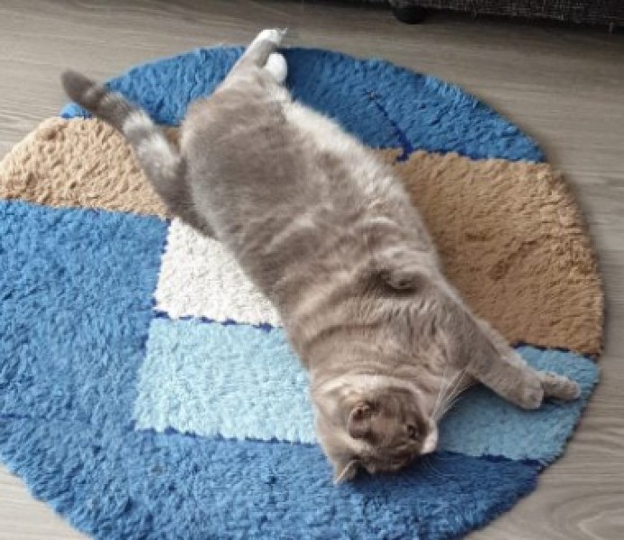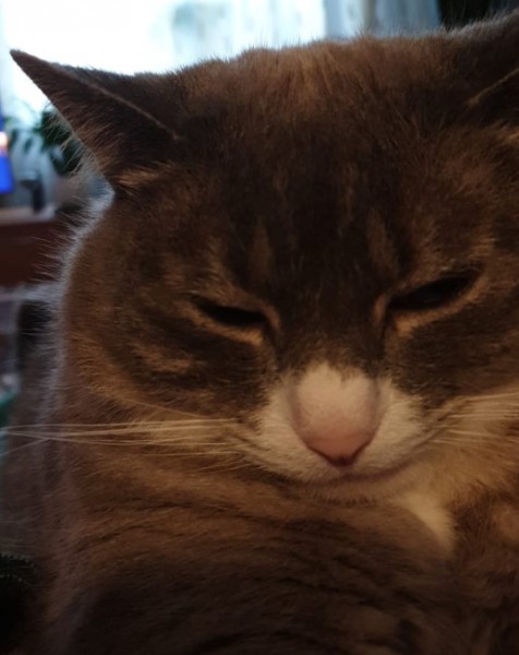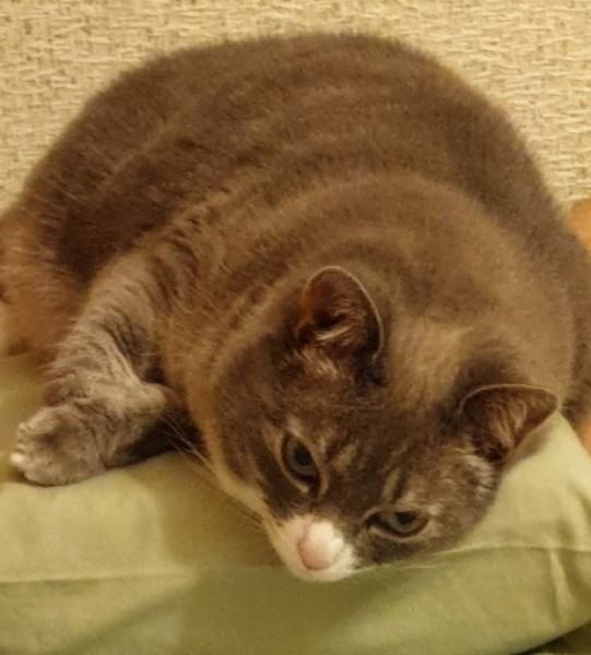 Pelēka ar izteiksmīgi baltu purniņu, zilas, lielas acis.