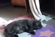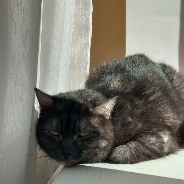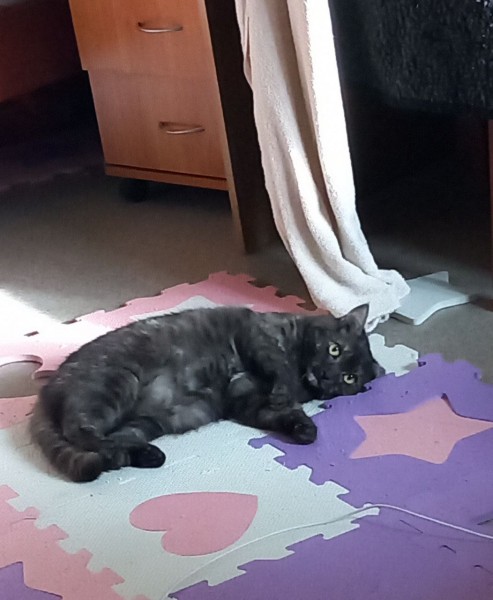 Pelēka, uz astes trīs baltās līnijas, virs acīm gaiši aplīši, bailīga, atsaucās uz vārdu Kosja.