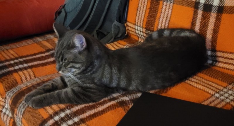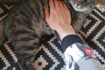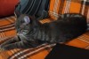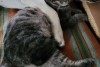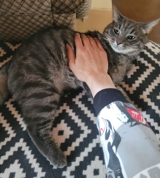 Mazs kaķis (apmēram 4 kg). Pelēks ar baltām svītrām. Ļoti bailīgs.