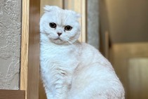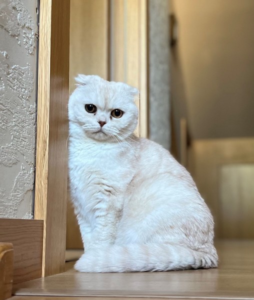 Skotu nokareno ausu kaķis Pūks, krēmkrāsas, vidēja lieluma.