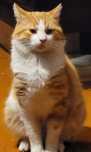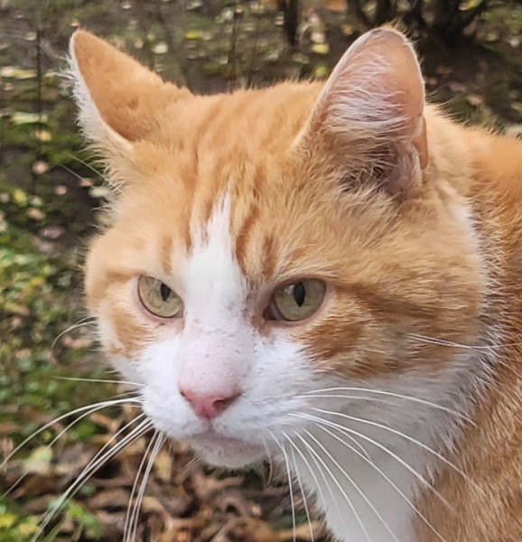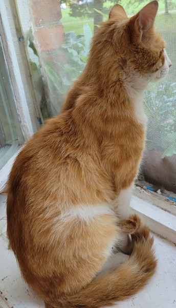 Ruds kaķis vārdā Rižoks, ar baltām ķepām, krūtiņu un vēderiņu. Uz deguna neliela aizaugusī rēta. Mēdz zaudēt apmatojumu muguras lejasdaļā. Uz labās ķepas nesen izskūts pleķis analīžu noņemšanai. Pazīst apkaimi, bet vairās no svešiniekiem.