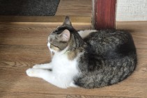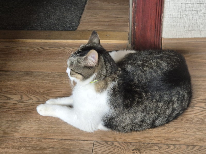 Ap kaklu zaļa siksniņa. Strīpaina mugura.Kakls kājas gaišas. Atsucās uz vārdu Lūkass.