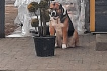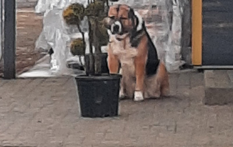trīskrāsu aziāts, kupētas ausis un aste, mugura melna, kr;utis baltas, ķepas brūnas