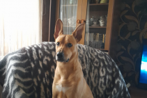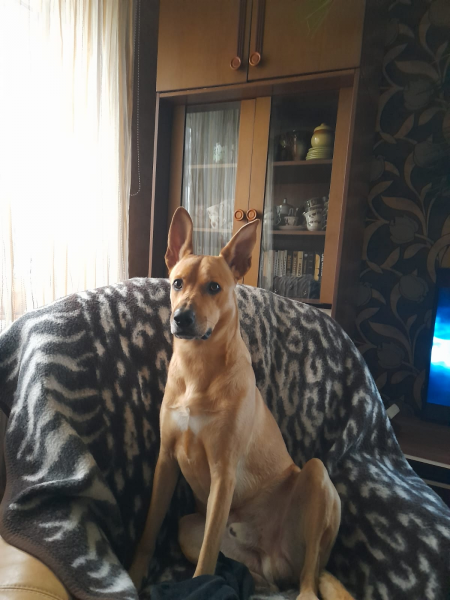 Dzelteni-brūnā krāsā ar stāvošām ausīm.