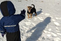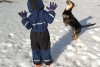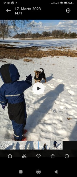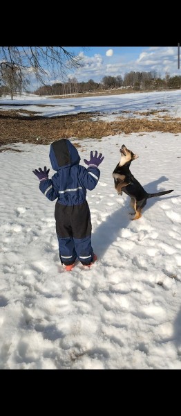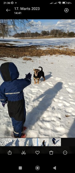 Ap kaklu melna siksniņa ar zaļu piekariņu ar inicjaļiem un manu telefona numuru.