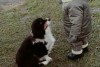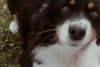 Melnā krāsā, uz krūtis baltā krāsa, virs actiņām brūnganas uzacis, apkārt deguntiņam balts.