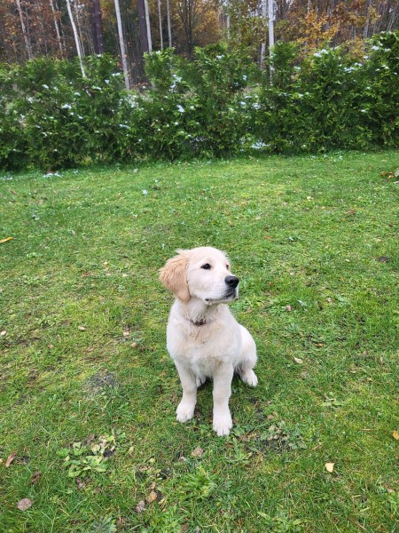Zeltainais labradors, gaiša/ bēša krāsa, 4 mēn. veca, atsaucas uz vārdu Pepa.