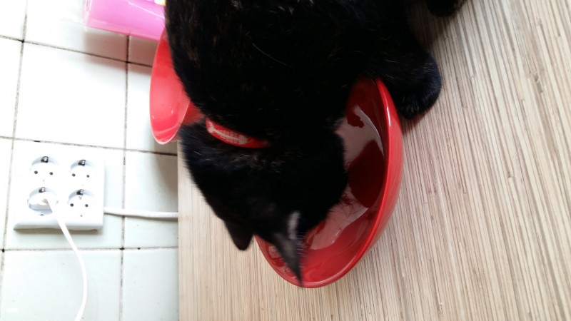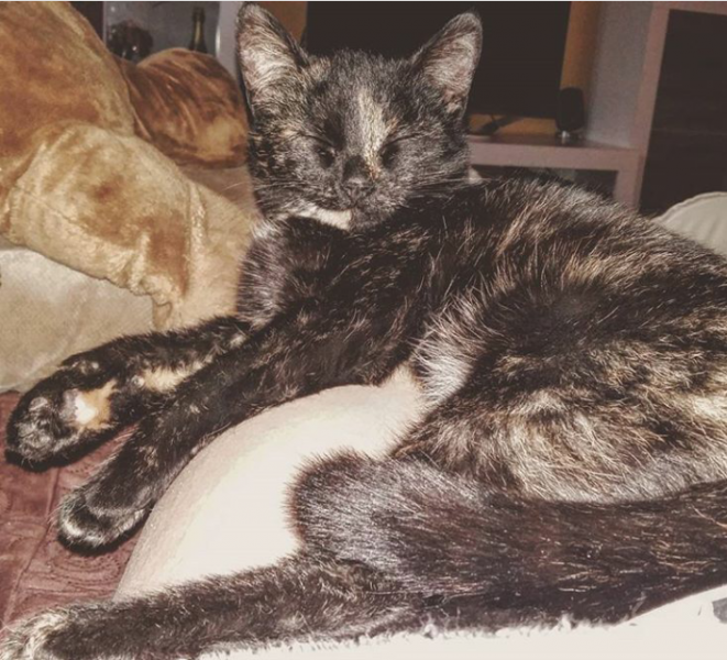 Trīs krāsu, pamatā melna, maza auguma kaķenīte ar sarkanu kakla siksniņu.
