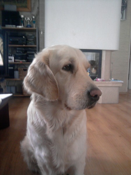 Zeltītais retrīvers gaiši dzeltenā krāsā ar rozā kakla siksnu, 5 gadi, atsaucas uz vārdu Tīna.