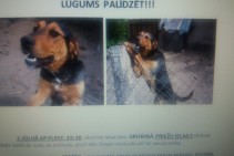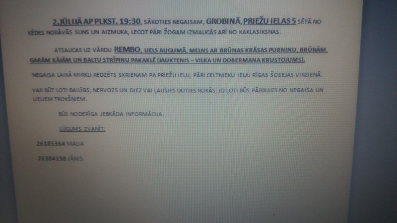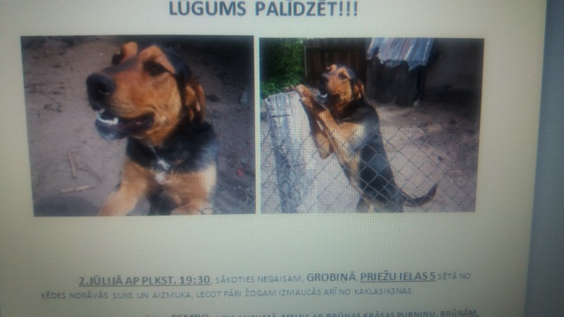 Vārds REMBO.Vilka un dobermana krustojums,liela auguma ar garām kājām,brūns purniņš un kājas,pats melns,8 gadi.Pazuda negaisa laikā,norāvās no ķēdes un izmaucās no kaklasiksnas.Var būt bailīgs,nervozs, nedoties rokās,jo pārbijās no pērkona un zibens.