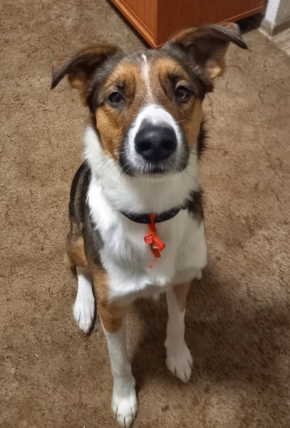 Triskrasains,aste gredzena, baltas ķepas,melna mugura pats brūni rižs.