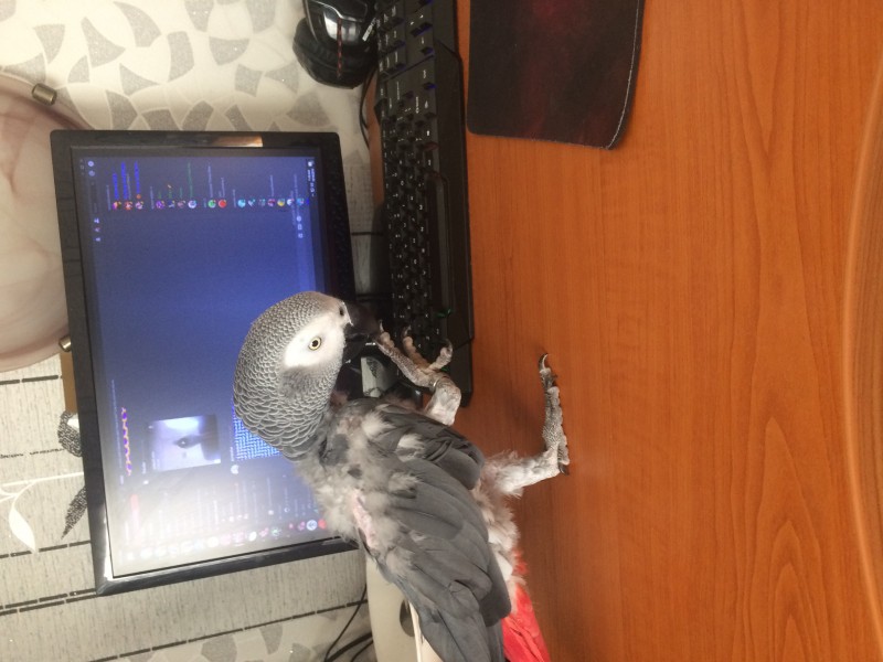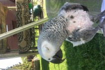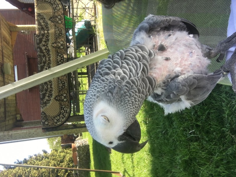 āfrikas pelēkais papagailis, ar maz spalvām uz vēdera, ļoti skaļs