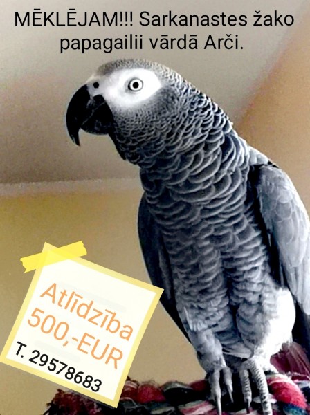 Pazuda pēlēks papagailis žako ar sarkanu asti, Dreiliņos, Stopiņu pagastā. Runā, svilpo, atskaņo dažādas skaņas. Ja atradāt, lūdzam atgriezt par 500 eur atlīdzību. Ja ir redzēts, liels lūgums ziņot, zvanot uz norādīto tālr. vai watsap.