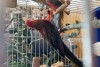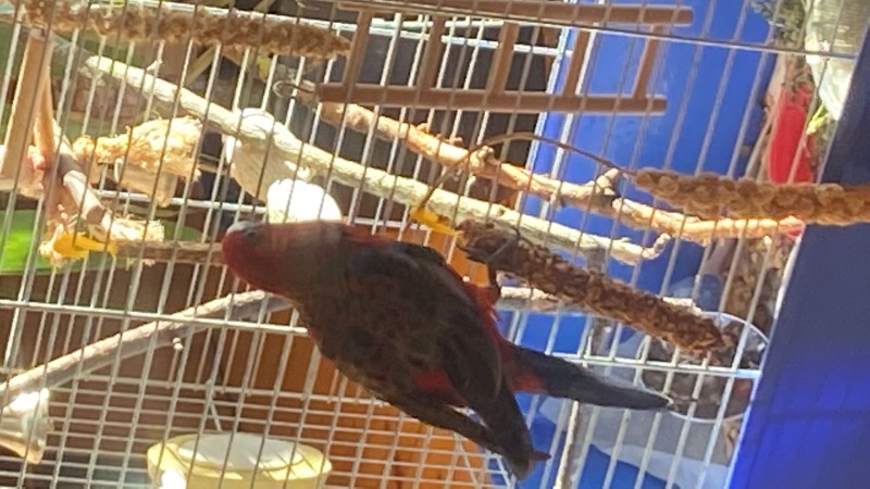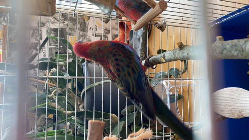 Sarkani zila Rozella papagailis. paleis putniņš, nelido klāt un ir ļoti kautrīgs. īpatnēja balss. Varētu būt, ka ielido pa kādu logu vai durvīm.