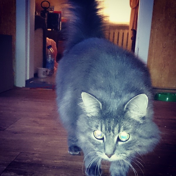 vienā acī ir mazs brūns punktiņš. Atsaucas uz vārdu Pūka. Gara spalva. Nedaudz strīpaina.