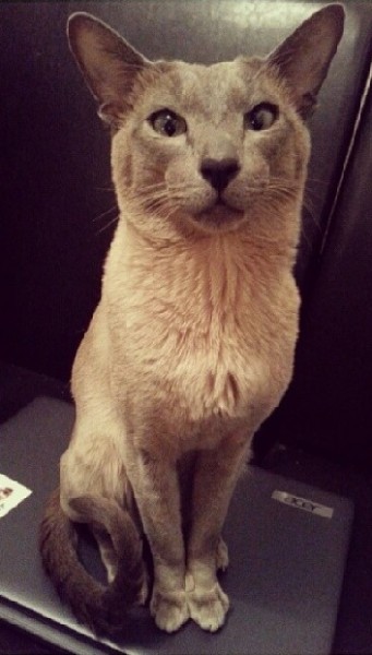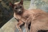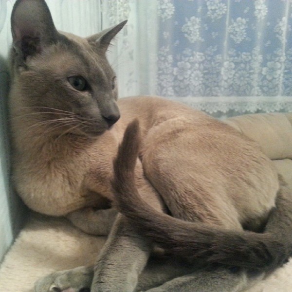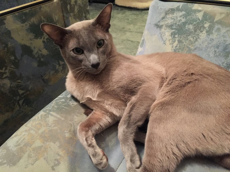 Orientālās šķirnes kaķis. Pelēkā krāsā, īsspalvainais. smalkas miesas būves, ar garām ķepām, asti, palielām ausim.