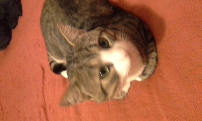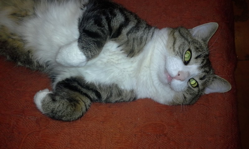 Muguriņa raiba, vēderiņš balts, visas četras ķepiņas baltas, rokās nedodas