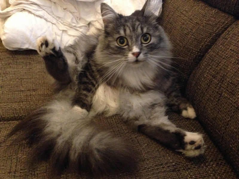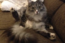 Garspalvaina, persieša un bezšķirnes kaķa krustojums, neliela auguma, pelēka, lielām acīm. Atsaucas uz vārdu Mika.