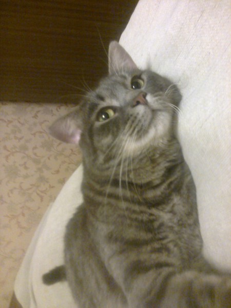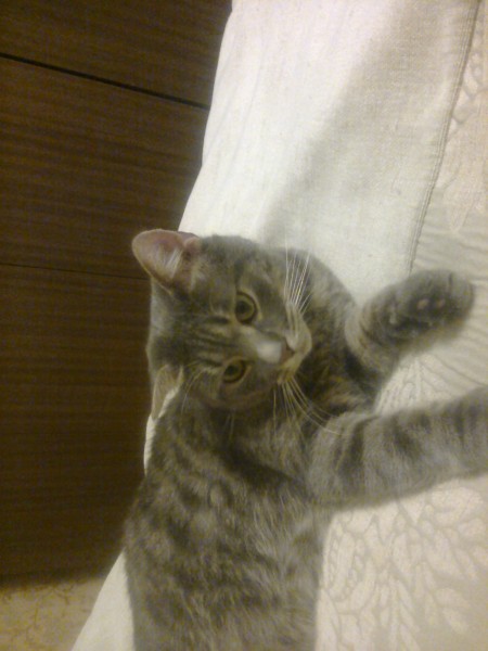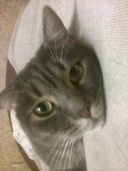 Mincis,ļoti mīlīgs,īsspalvains,pelēks ar tumšākām svītrām,bailīgs,viena auss pieliekta,sarkana siksniņa