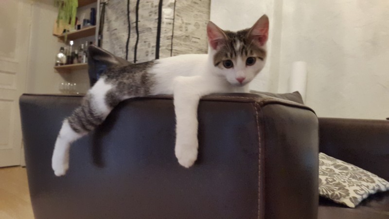 Īpašās pazīmes - Balts ar pelēkiem, strīpainiem plankumiem. Astes galiņš balts. Ļoti draudzīgs un mīļš.