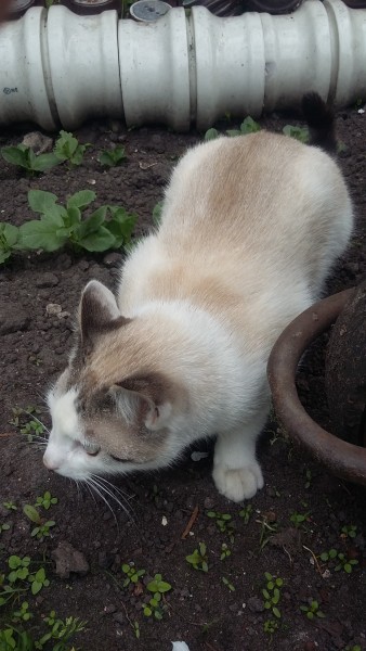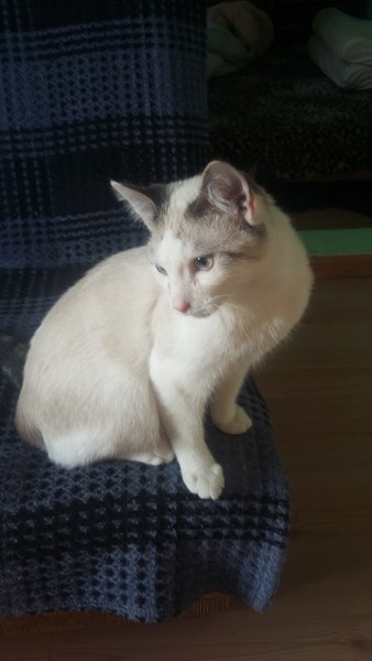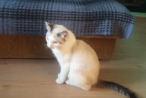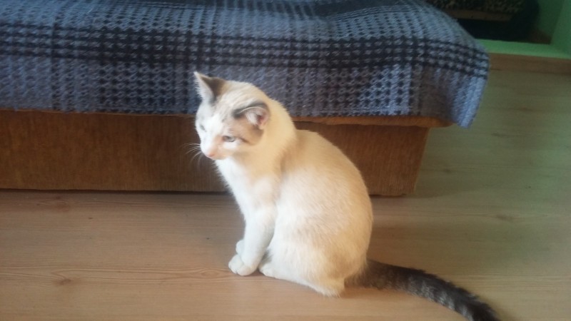 Krēmkrāsas ar tumšu, raibu asti un ausīm.
