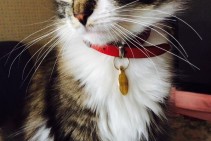 Ap kaklu sarkana siksniņa ar vārdu Rūša un tel.nr