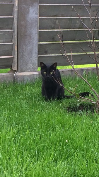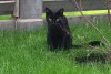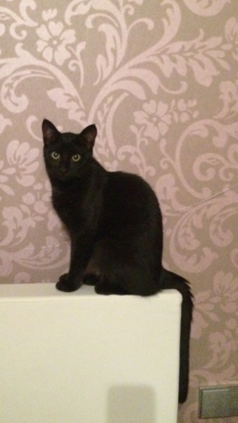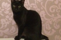 Melna kaķenīte 1 gadu veca. Uz krūtiņām dažas retas baltas spalviņas.