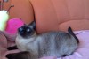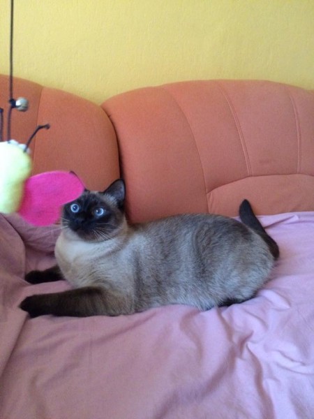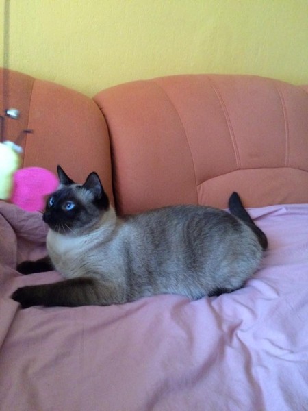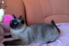 Siāmas tipa kaķene. Tumši brūnu galviņu, asti un tumši brūnām ķepām. Zilām acīm. Padūšīga auguma.