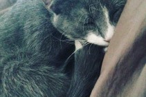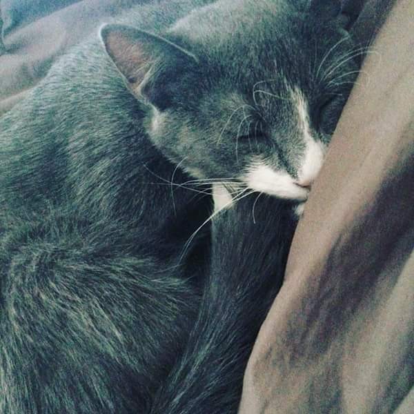Tumši pelēks ar baltu deguntiņu, baltiem ķepu galiņiem un uz krūtīm arī balts pleķītis.