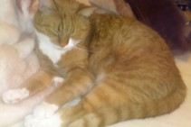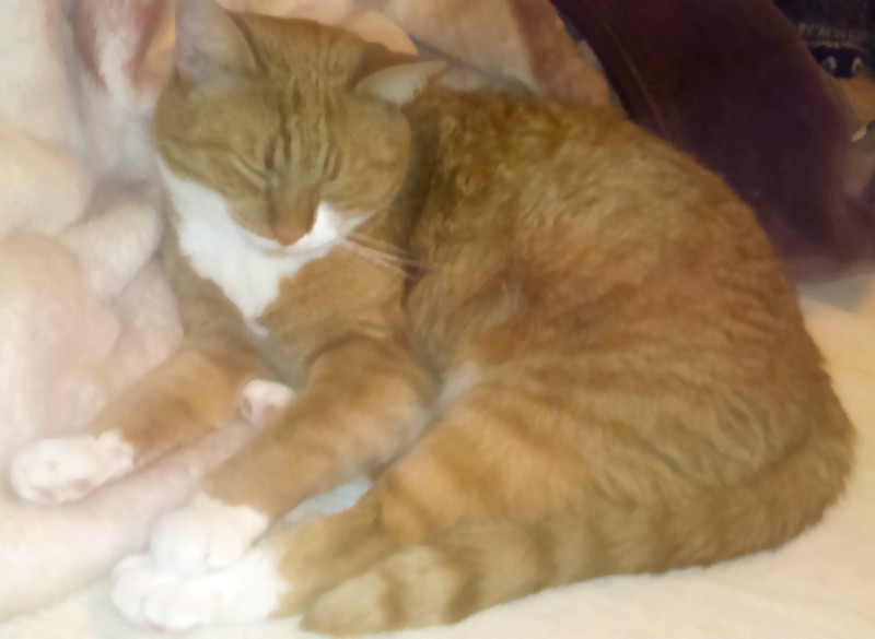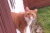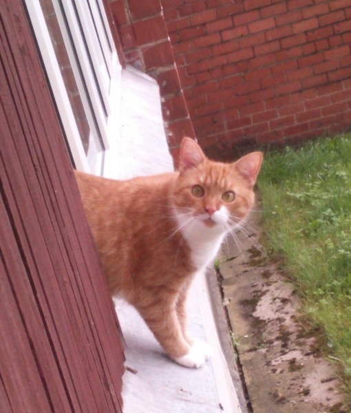 Spilgti ruds ar baltām ķepām un krūtežu, kreisā purna puse balta. Mājas kaķis, bailīgs.