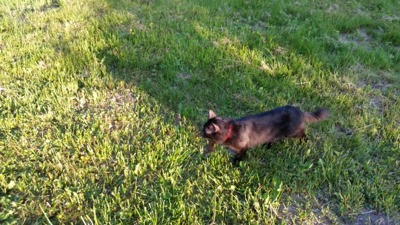 Pazudis melns kaķis ar sarkanu kakla siksniņu Saulkrastos Mežvidos autobusa galapunkta rajonā naktī no 29.uz 30.jūliju