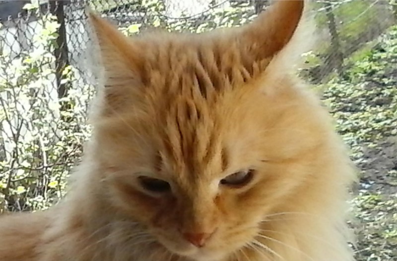 Ruda kaķenīte ar pūkainu spalvu. sterilizēta .Sarkana un dzeltena kaklasiksniņa.