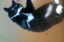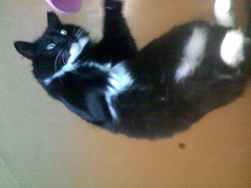 Labajā actiņā paliels pelēks plankums, nokniebts auss galiņš.Melna ar baltu krūtiņu un ķepiņām, kuplu asti.Bailīga, jo laukā nav bijusi kopš bērnības.