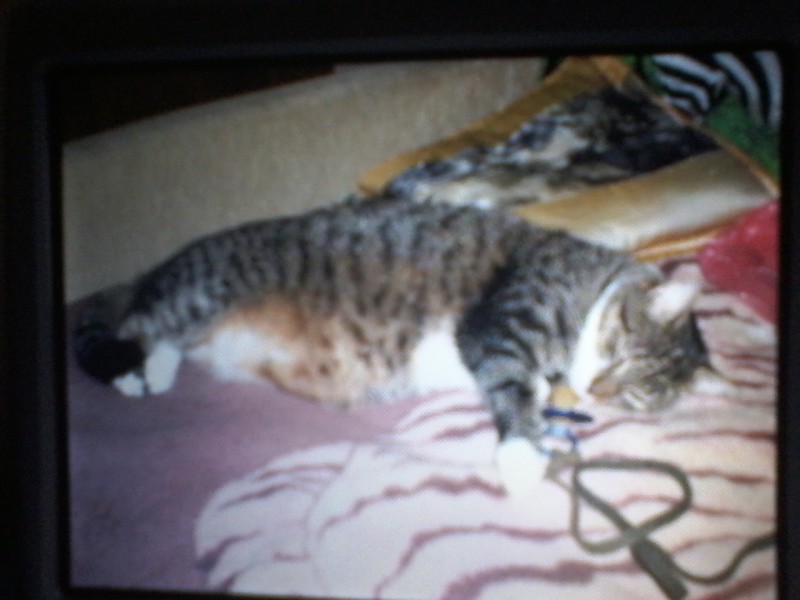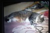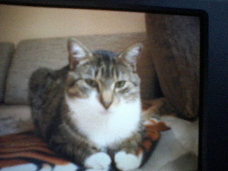 Raiba kaķenīte ar baltu priekšu.Priekšējās ķepas baltas,pakaļkājai vienai baltums ir lieļāks,otrai kājai mazs baltums.
